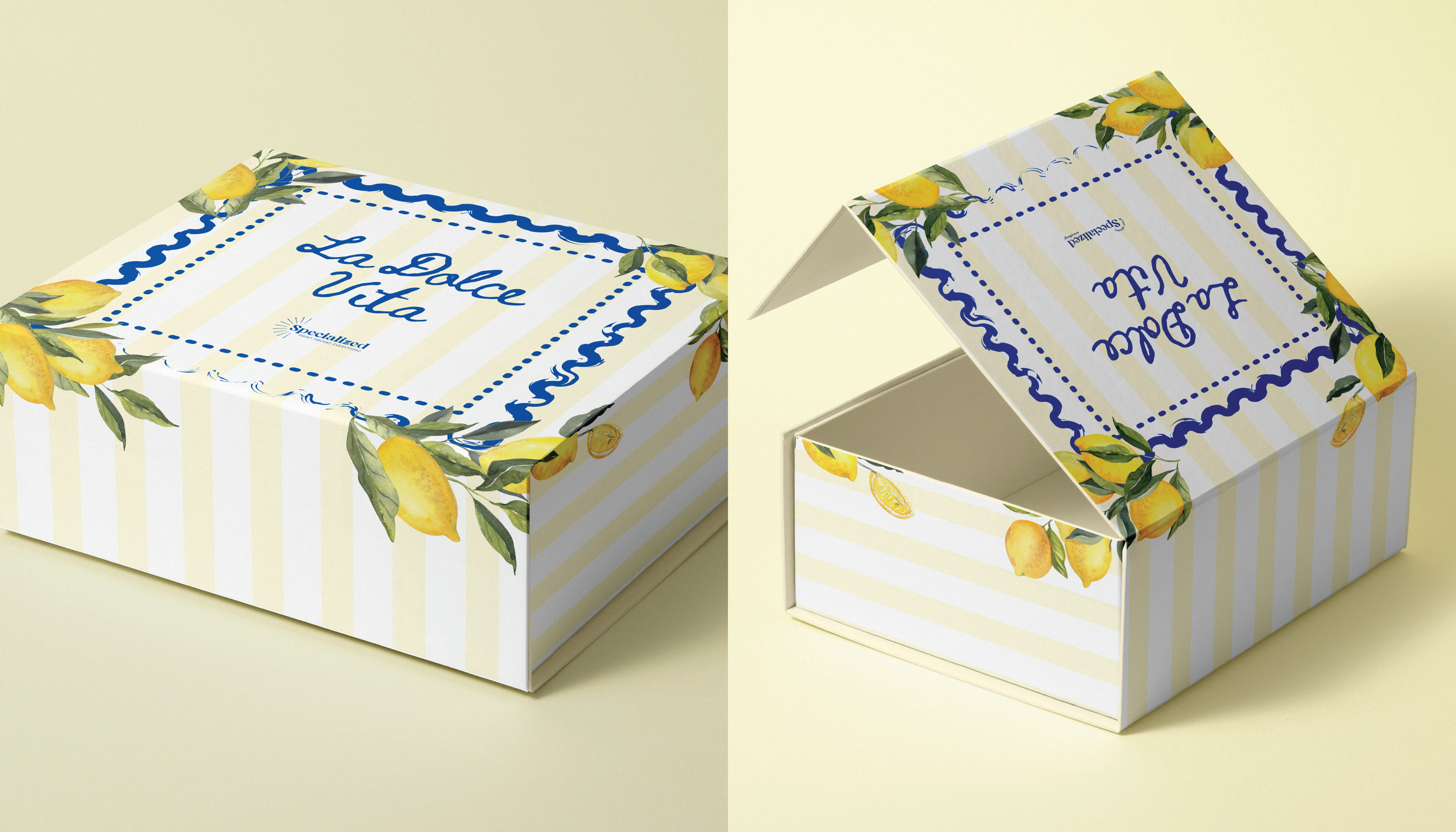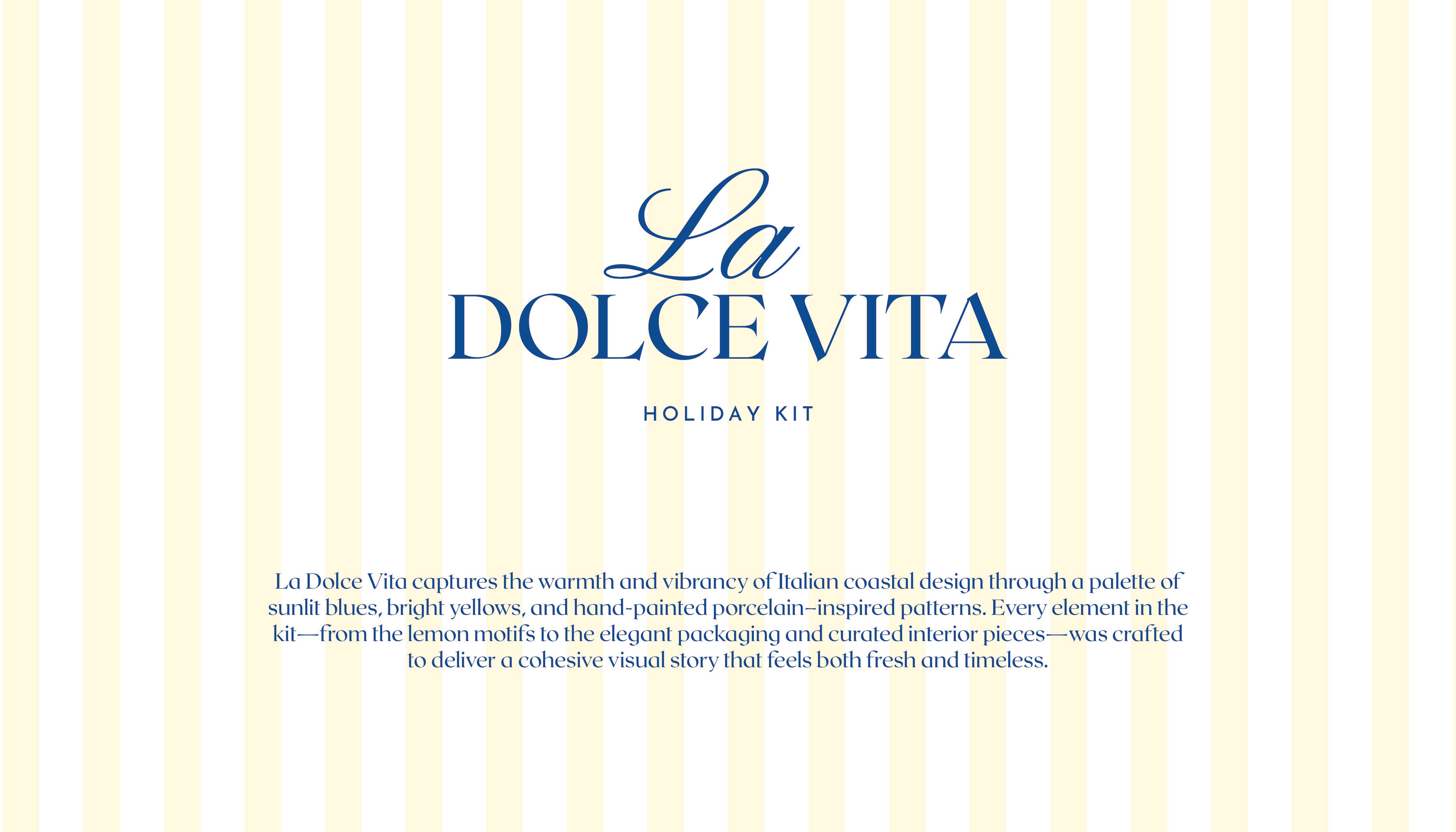 La Dolce Vita captures the warmth and vibrancy of Italian coastal design through a palette of sunlit blues, bright yellows, and hand‑painted porcelain–inspired patterns. Every element in the kit—from the lemon motifs to the elegant packaging and curated interior pieces—was crafted to deliver a cohesive visual story that feels both fresh and timeless.
